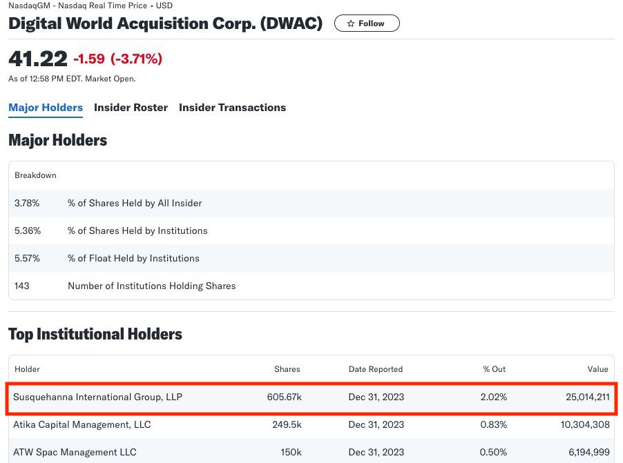The biggest institutional investor in the SPAC that’s merging with Truth Social is Susquehanna International Group LLP, which was co-founded by GOP megadonor Jeffrey Yass.