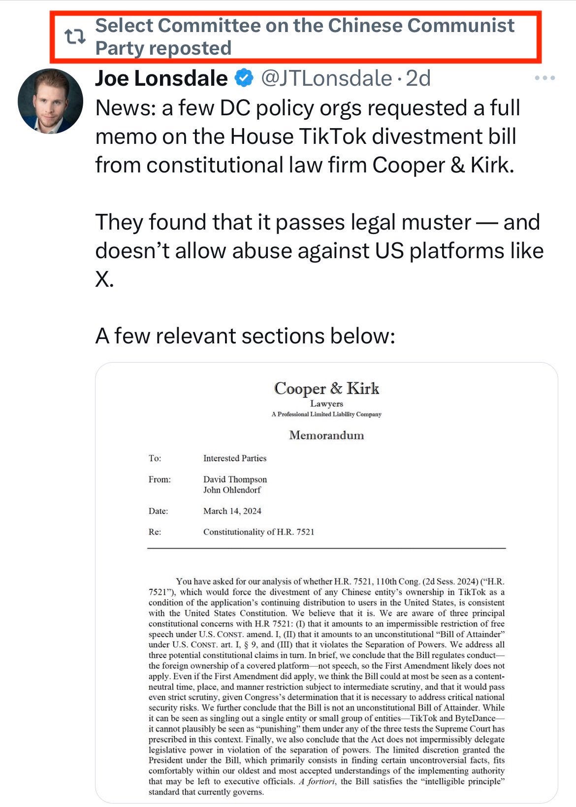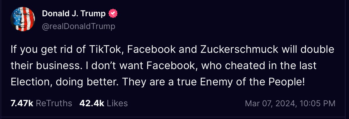 Jeffrey Yass is a republican mega donor [the top donor in the 2024 US election cycle - donating more than $46M to Republican causes in the 2024 election cycle] and is a major investor in ByteDance (7% or $15B). Yass is speculated to be be the person behind a sudden change of heart that saw Donald Trump oppose banning the Chinese-owned video app despite having tried to do it himself while in office. Trump on Truth Social after the reversal and before the House overwhelmingly passed (on Mar 13th) to regulate TikTok: