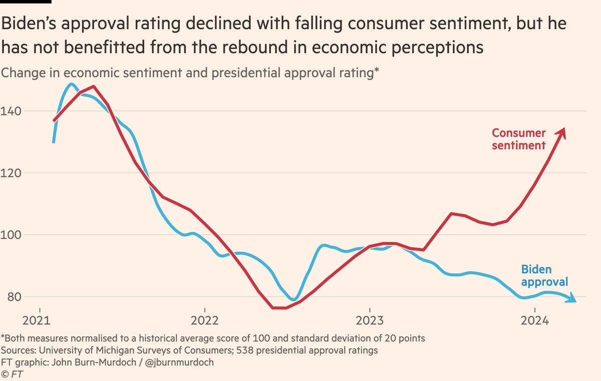 Biden’s approval ratings declined steeply alongside falling consumer sentiment, but as people’s perceptions of the economy have improved, his ratings have remained low.