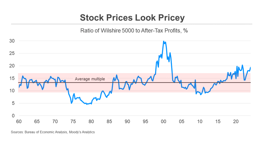 But asset prices look pricey and vulnerable to a serious correction, especially if the Fed doesn’t follow through on expectations and cut rates. Price-to-earnings in stocks and price-to-rent in housing look high. Sharply lower prices would diminish, even undermine, the economy.