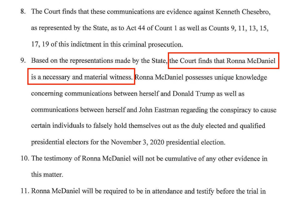 However, in the Fulton County, GA case (Case Background: An Atlanta-based grand jury on August 14, 2023, indicted Trump and 18 others on state charges stemming from their alleged efforts to overturn the former president’s 2020 electoral defeat. Four people have pleaded guilty. Case is lead by DA Fani Willis) - Ronna McDaniel is listed as a “necessary and material witness:”