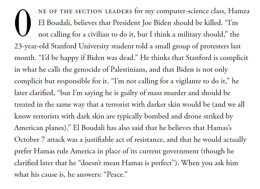 ATLANTIC: THE WAR AT STANFORD. Student at Stanford calling for Joe Biden to be assassinated, and expressing a preference for Hamas to rule America. [TS] The opening anecdote is wild: