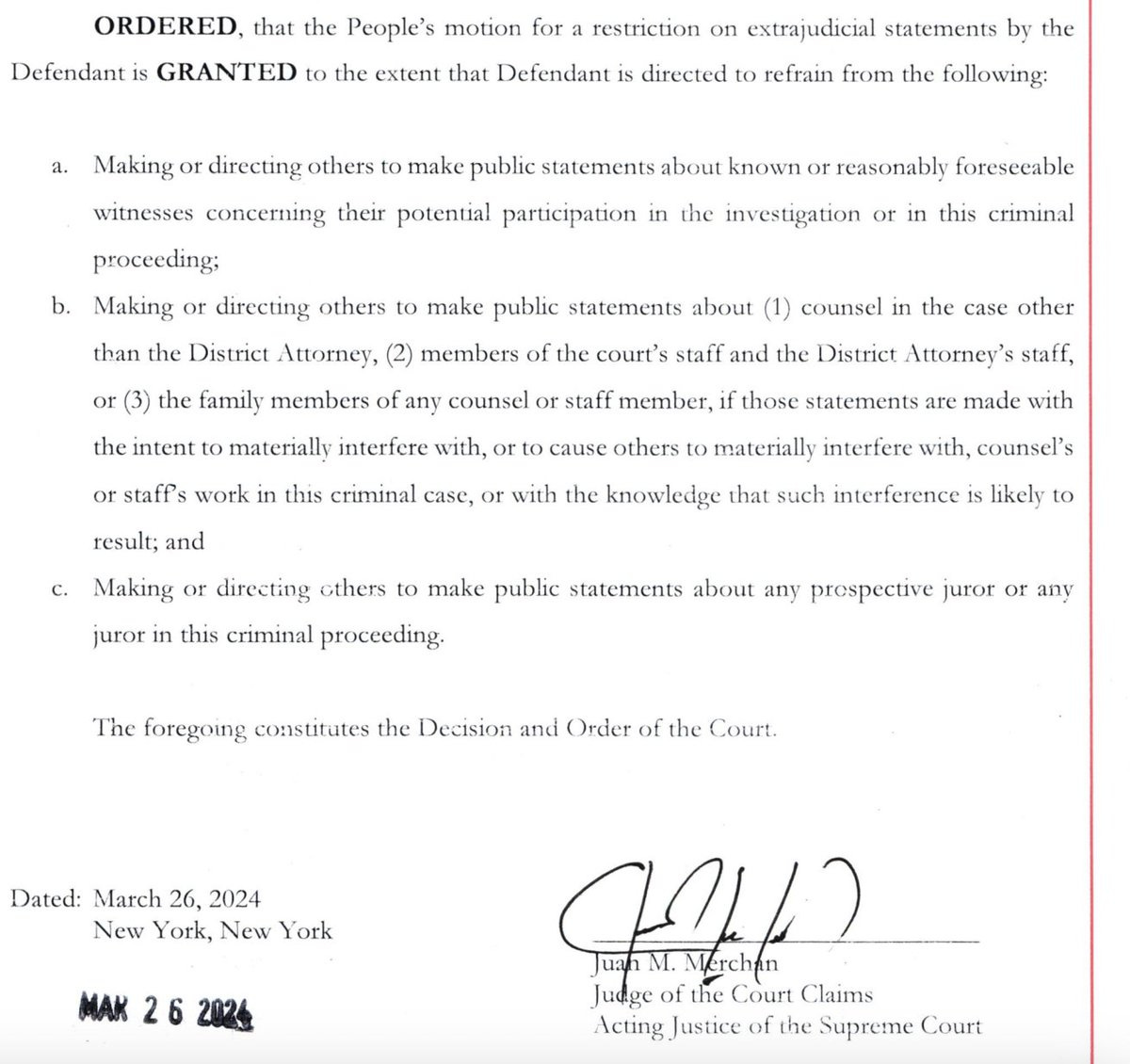 6.) POLITICO’s Kyle Cheney: NY judge issues a gag order restricting Trump's ability to attack witnesses, prosecutors, their families or jurors. Doc Link: