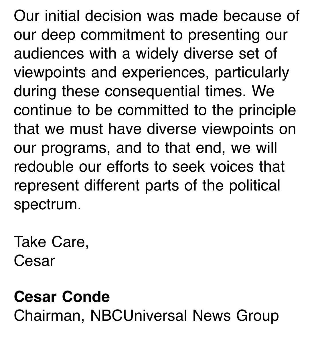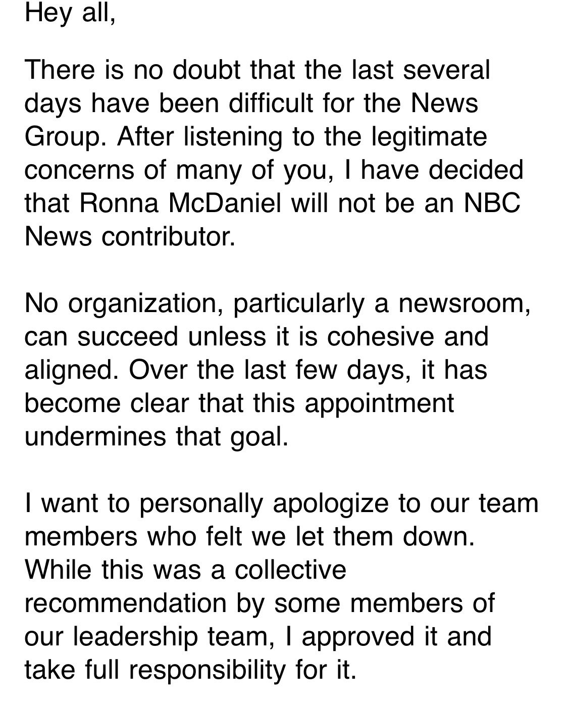 NBC News Chairmen Cesar Conde emails staff to let them know *he* made decision to cut ties w Ronna McDaniel “I have decided that Ronna McDaniel will not be an NBC News contributor” He also apologized & took accountability “I approved it and take full responsibility for it.”