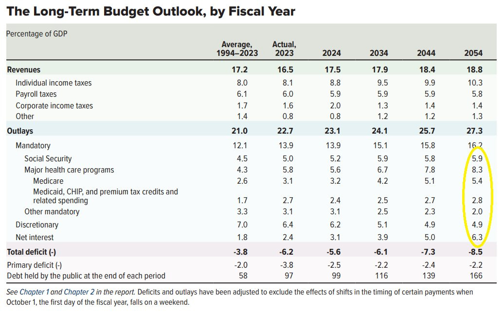 11.) By 2054 CBO projects that based on current law, Net Interest on Debt will be the largest category of spending in the federal budget. At 6.3% of GDP, interest on debt will be larger than Social Security and Medicare... and the entire discretionary budget: