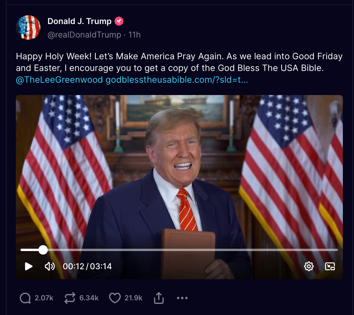 4.) Trump is doing a paid endorsement to sell bibles with Lee Greenwood during Christianity’s “Holy Week.”