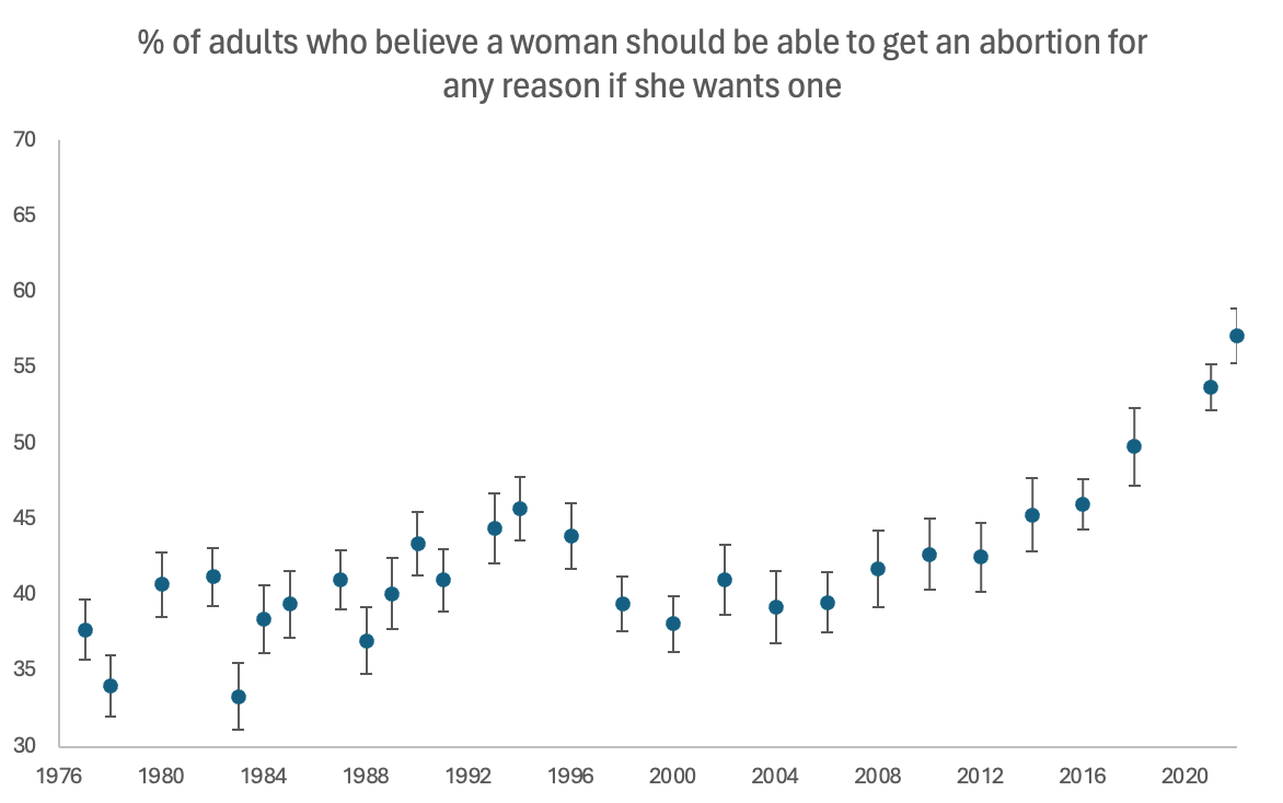 Public support in the GSS for "Women should be able to get an abortion for any reason if she wants one" has gone from 42% in 2012 to 57% in 2022!