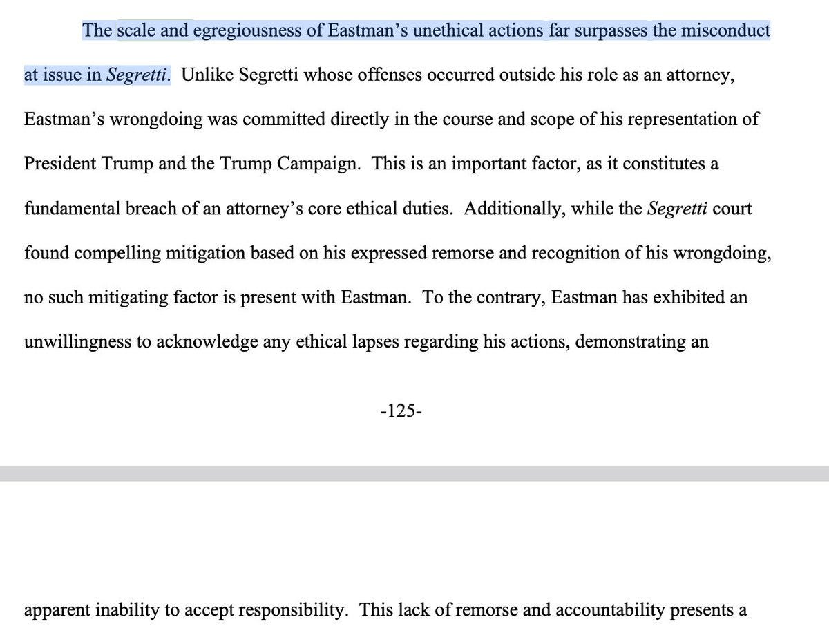The Bar found that “The scale and egregiousness of Eastman’s unethical actions far surpasses the misconduct at issue in Segretti.” In short: California State Bar recommends that John Eastman be disbarred.