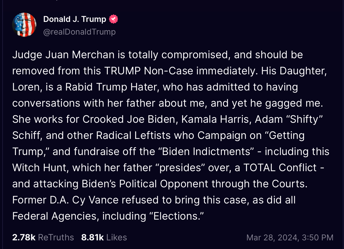 6.) [UPDATE] Hush-money case: Trump has continued to attack Judge Merchan's daughter since Monday's hearing affirming his trial date, but now names her for the first time on his website. (The daughter isn't included in the partial gag order, and neither is the judge himself.)