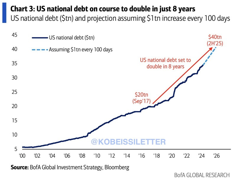 15.) Per Kobeissi Letter: The US Federal debt is set to DOUBLE in just 8 years, rising from $20 trillion in 2017 to $40 trillion in 2025.