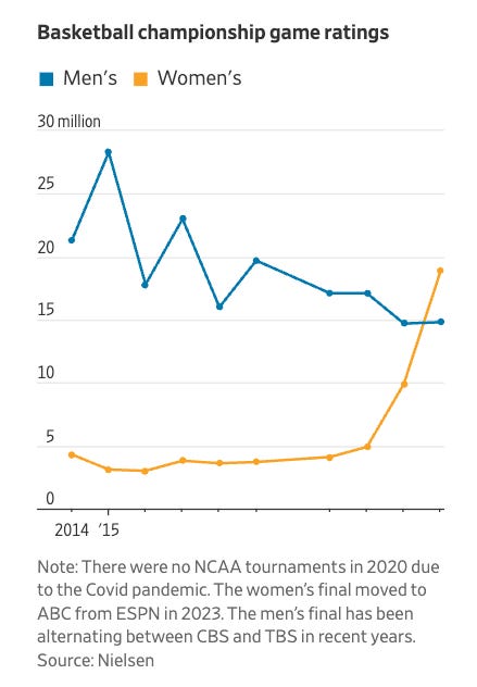 1.) 2024 Men’s NCAA basketball championship had similar viewership to last year (14.8M vs 14.7M) - 4M less than women’s game (SC vs IA).
