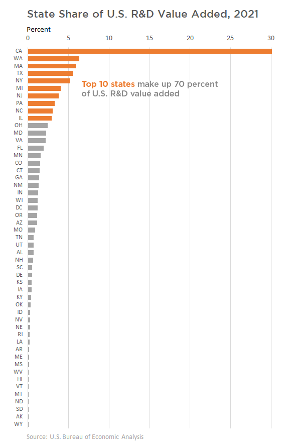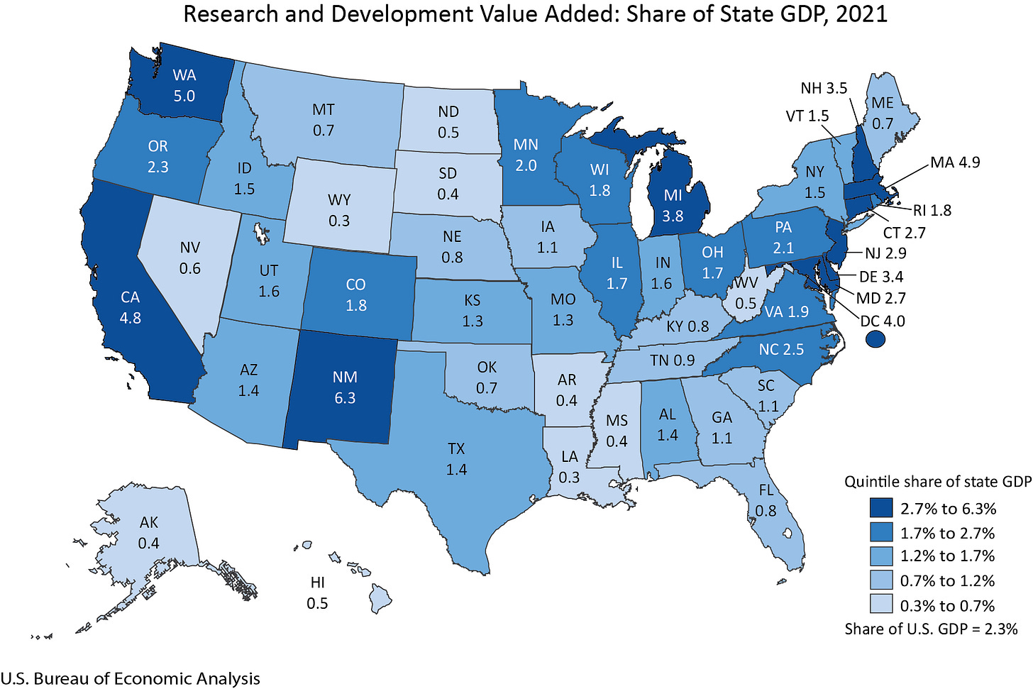 Research and development activity accounted for 2.3 percent of the U.S. economy in 2021, according to new experimental statistics released today by the Bureau of Economic Analysis. R&D as a share of each state’s gross domestic product, or GDP, ranged from 0.3 percent in Louisiana and Wyoming to 6.3 percent in New Mexico, home to federally funded Los Alamos National Laboratory and Sandia National Laboratories.