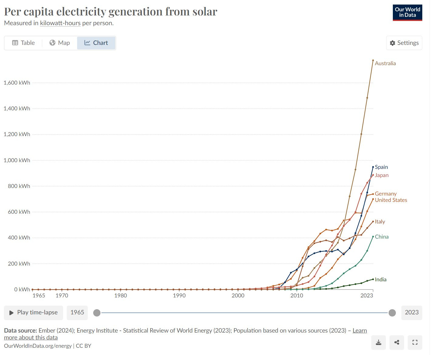 Australia really stand out on the solar graph. Per-capita generation doubled from 2019-2023, reaching the highest levels of any country ever, and makes up 17% of all the country's electricity: