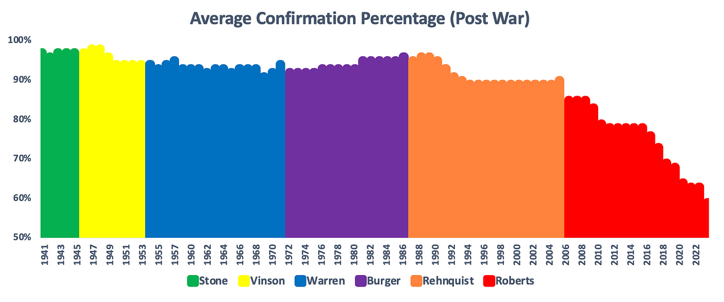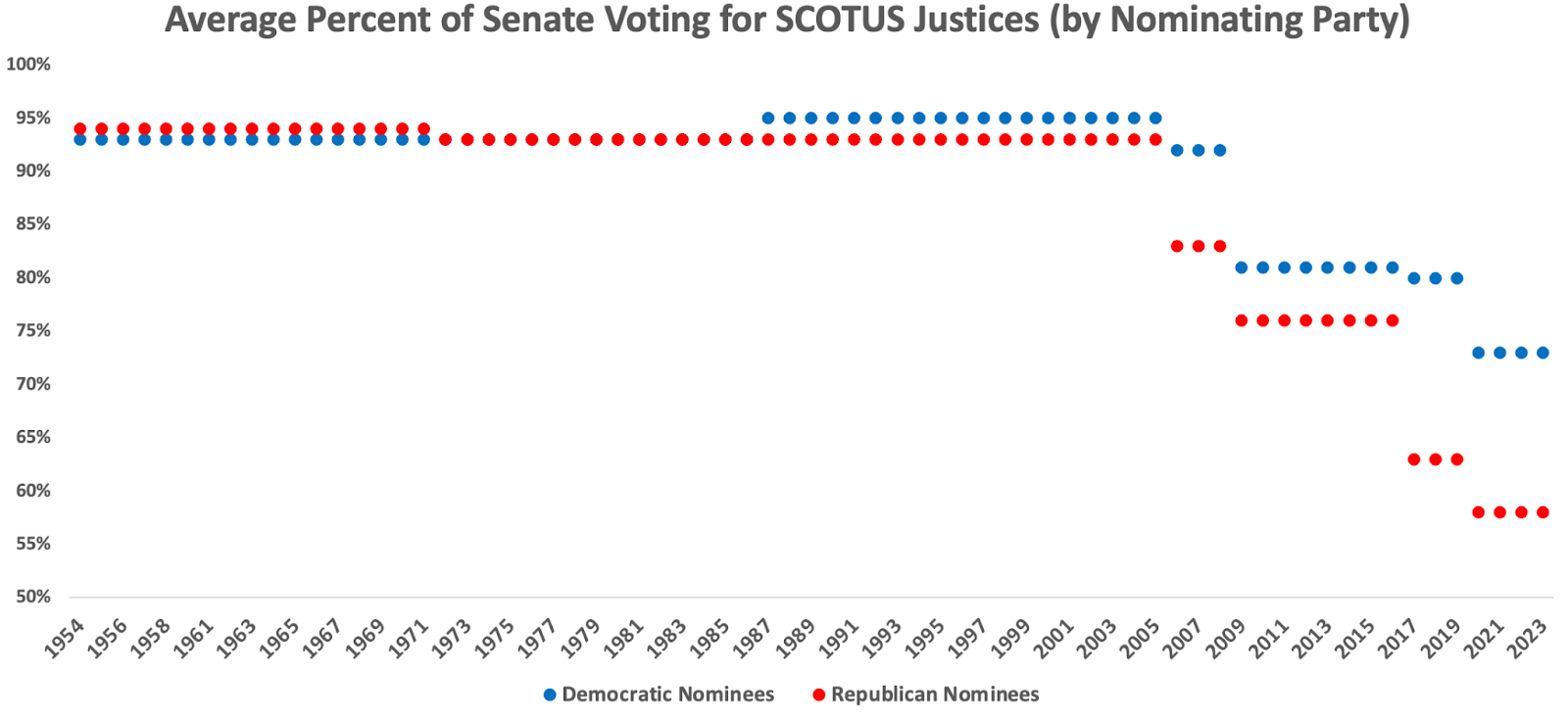 Support for SCOTUS justices was almost perfectly bipartisan until 2006. Since then, justices nominated by Democratic presidents have still had much higher support than the GOP’s Federalist Society nominees.