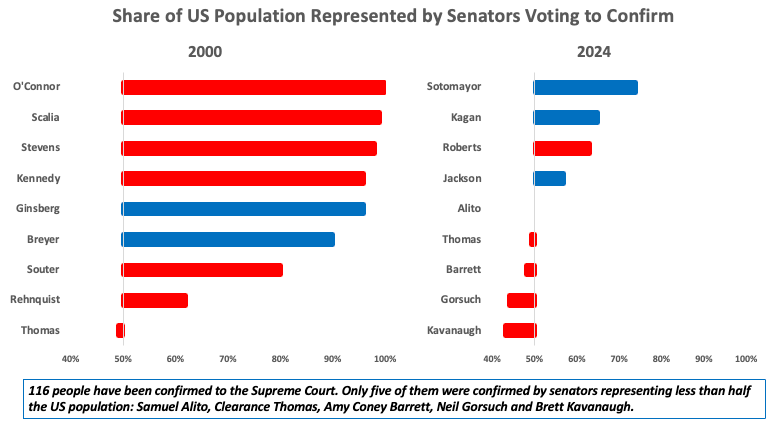 Out of 116 people confirmed to the Supreme Court, only five were confirmed by senators representing less than half the US population: Alito, Thomas, Barrett, Gorsuch, and Kavanaugh.