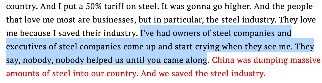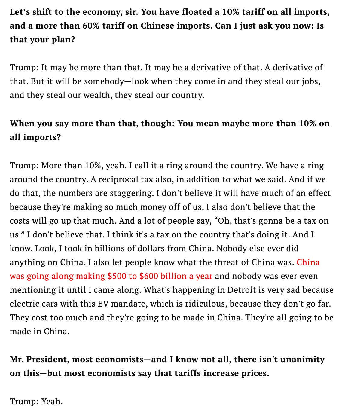 [TS] Trump's advisers keep downplaying the extent of his tariff proposals -- saying this 10% idea is just one more extreme idea among many -- but then Trump himself keeps suggesting he would actually like to be *more* aggressive.