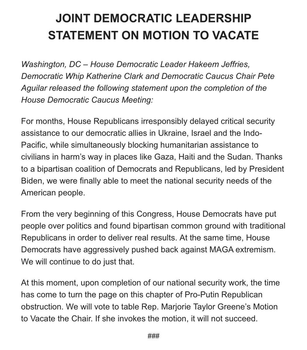 “We will vote to table Rep. Marjorie Taylor Greene’s Motion to Vacate the Chair. If she invokes the motion, it will not succeed,” House Minority Leader Hakeem Jeffries, Minority Whip Katherine Clark (D-Mass.) and Democratic Caucus Chair Pete Aguilar (D-Calif.) said in a statement.