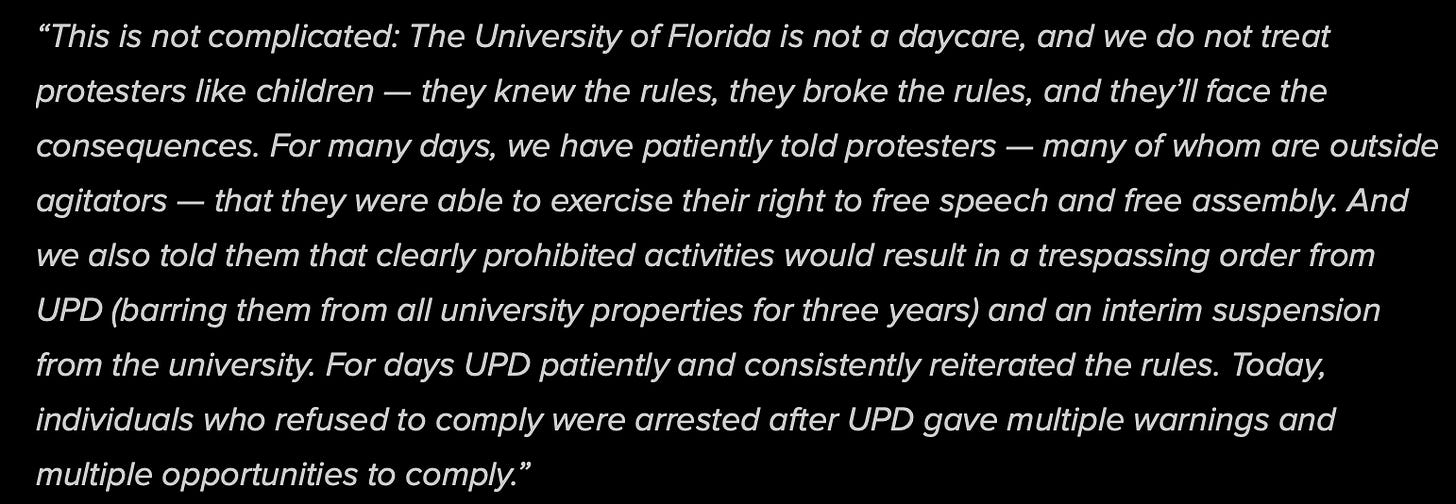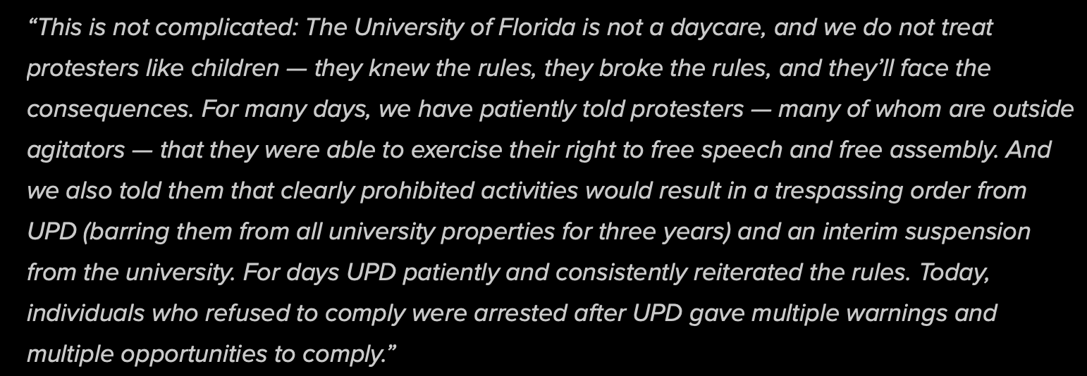 “This is not complicated: The University of Florida is not a daycare, and we do not treat protesters like children…”