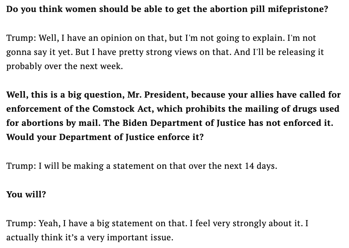 Classic punt on his views for the abortion pill (People who fear accountability always use the extension of time as an out). [TS] I’m sure he’ll get right on it, probably right after infrastructure week….or maybe after he reveals his healthcare plan….