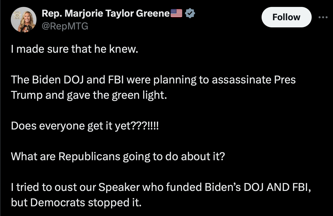 [TS] This is wildly irresponsible even for MTG. FBI knew Trump wasn’t there. It was all coordinated with Secret Service in advance.