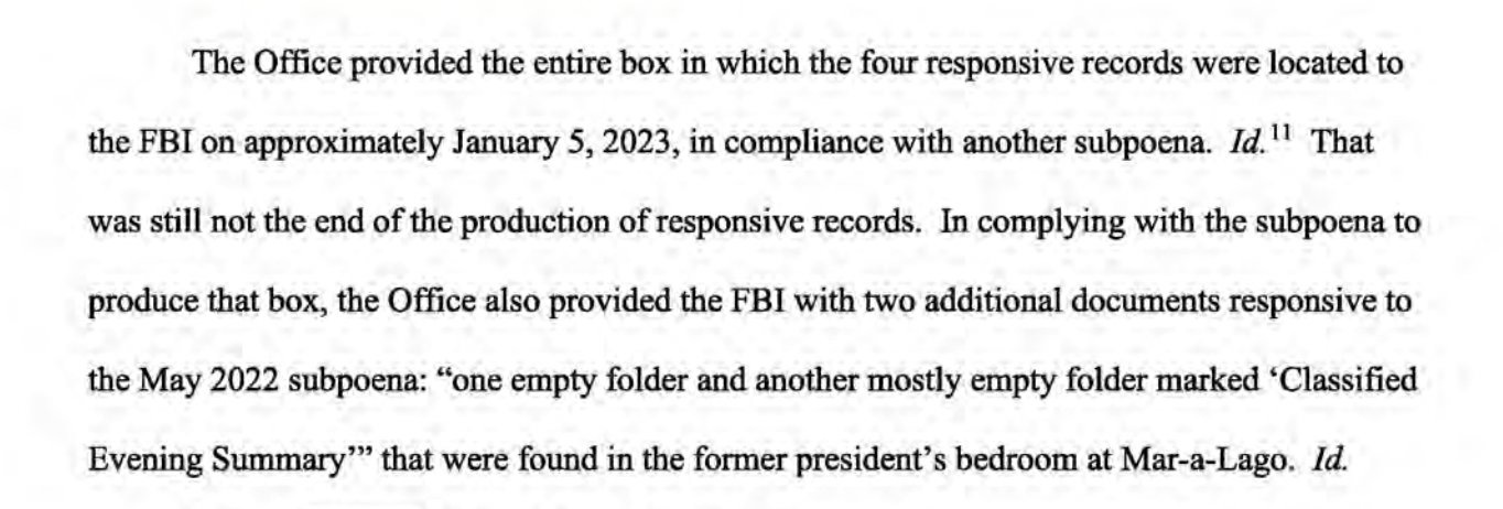 [TS] Additional info from the FL case: Trump not only had classified documents at Mar-a-Lago even after the FBI search, but that some of those documents were in his bedroom. He can't plausibly claim to have been unaware that they were there: