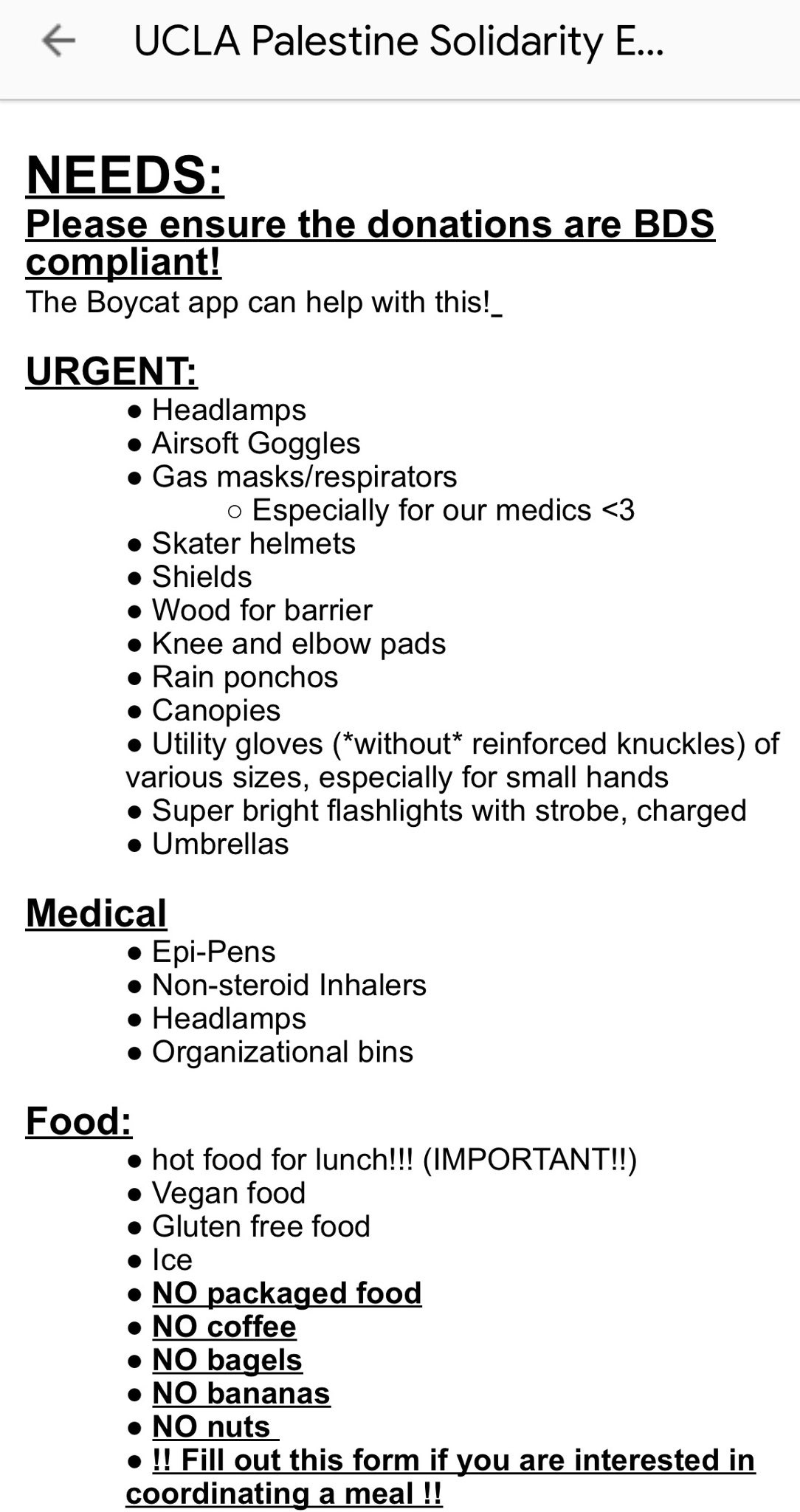 [RELATED / UCLA] Fox obtained a Google Doc with a list of needs that protestors at the UCLA camp are requesting: Vegan & gluten free food, “super bright” flashlights w/ strobe, rope & zip ties, helmets, shields, & wood, Lotion, “NO sunscreen,” knee & elbow pads etc.: