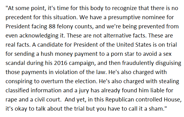 [UPDATE] After an extended delay, the Chair rules that McGovern's words are out of order, seemingly saying members cannot even talk about criminal charges against Trump on the House floor. The words below were stricken from the Record.