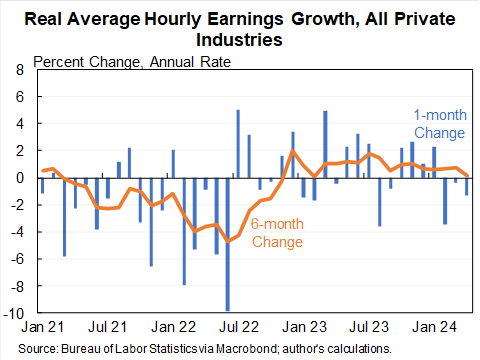 Average hourly earnings growth has been drifting down recently. Was strong for much of 2023 but negative three months in a row--zero for the last 6 months (I use a 6 month line instead of my usual 3 due to high volatility).