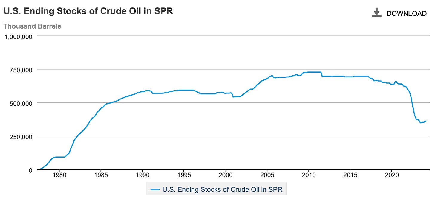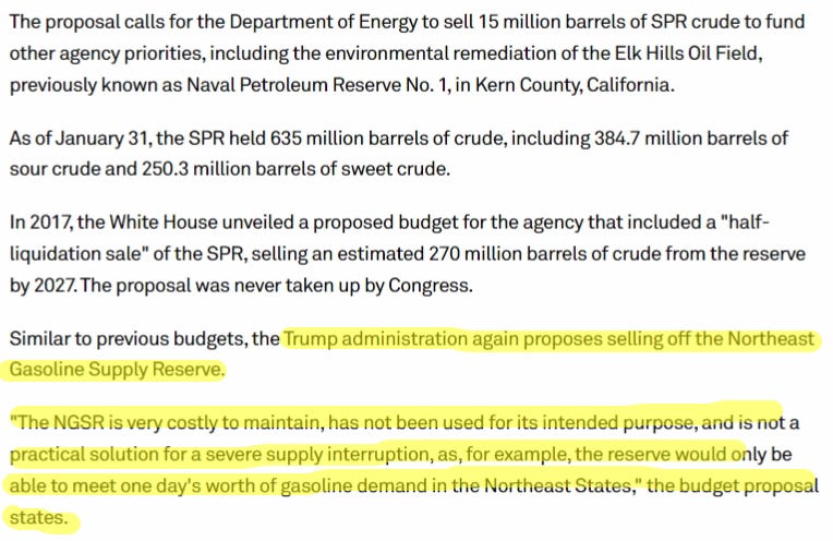 The oil reserve aka SPR, has been rising & is being refilled. It will continue to rise in the coming months. The (Northeast Strategic) gasoline reserve, the only in the nation, is being sold & closed.