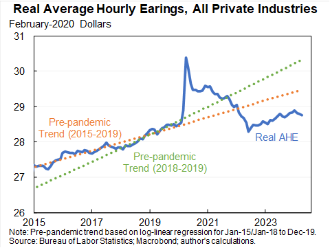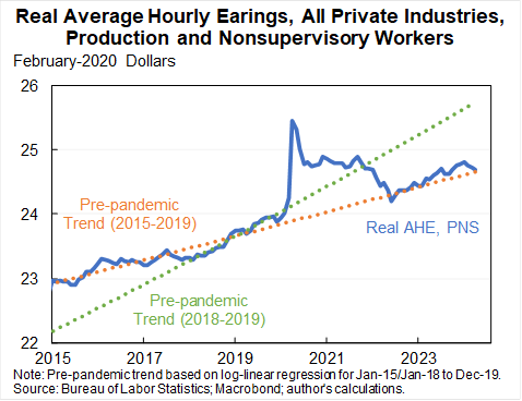 No matter how you look at it average hourly workers for all private sector workers are below trend. They're up at a 0.2% annual rate since pre-COVID, were growing much faster before then.