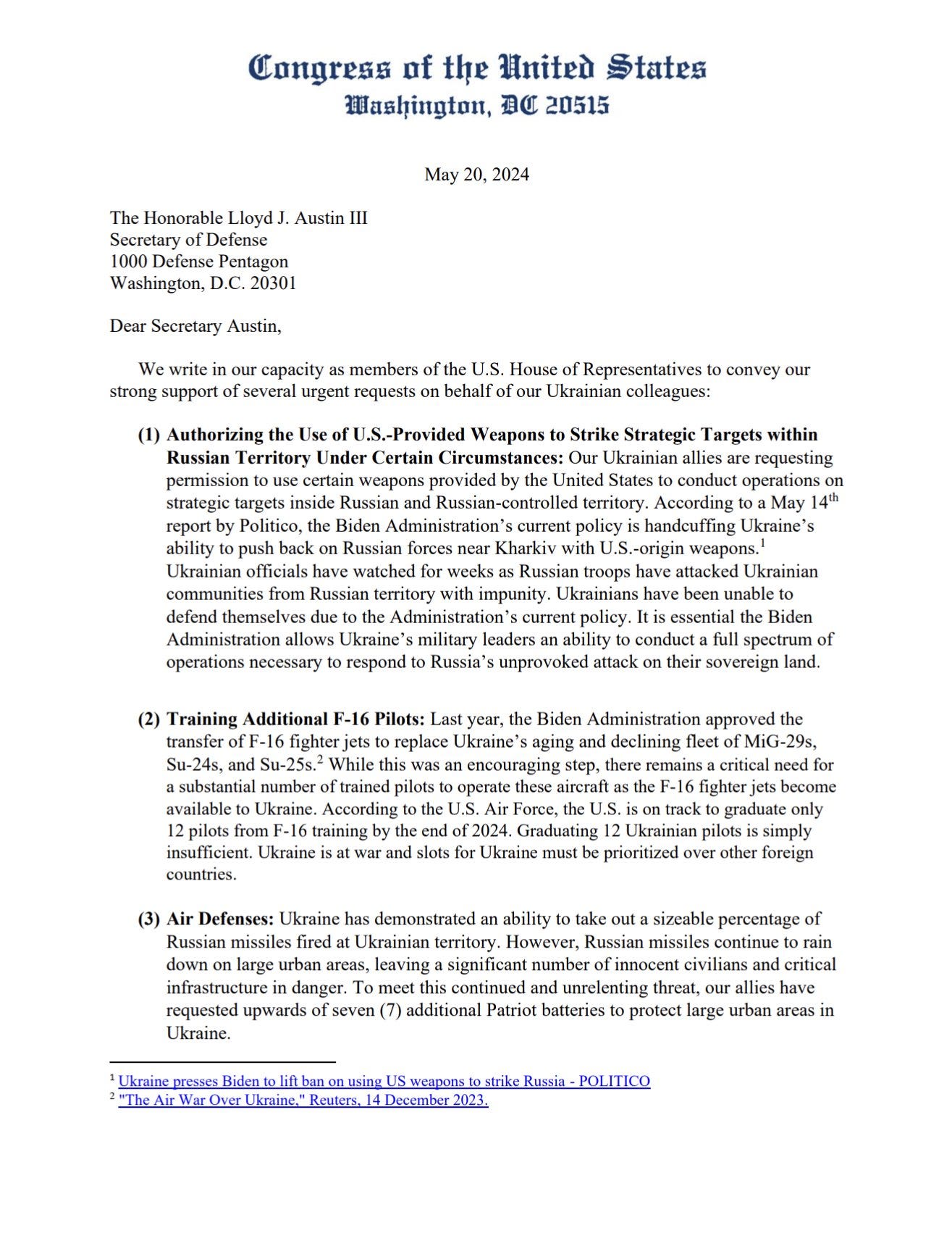 2.) US House Permanent Select Committee on Intelligence issued a bipartisan letter to Secretary of Defense Austin urging the administration to allow Ukraine to strike military targets inside Russia.