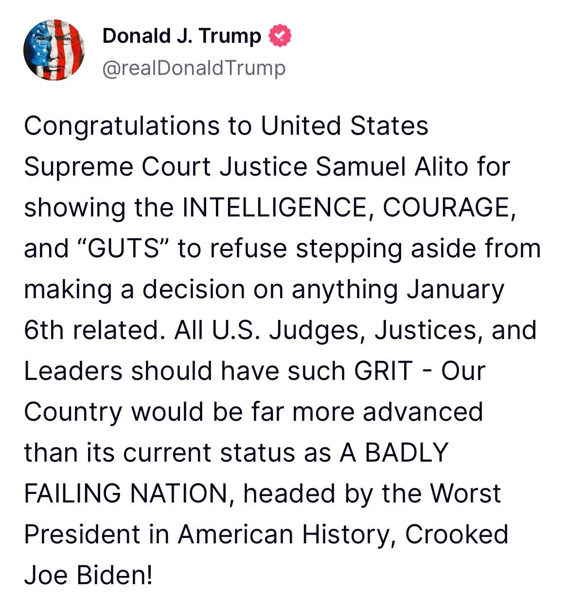 Trump thanks Alito for not recusing himself from cases pending about Trump after Alito’s being criticized for a flag flying at his house that has been interpreted as a sign of support for Trump: