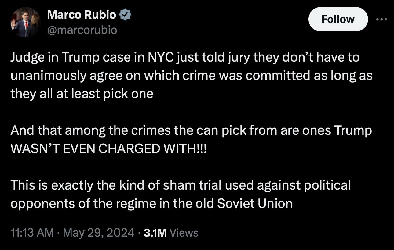 [TS] This falsehood created a firestorm within the Conservative base. Everyone hopped on to talk about how crazy it was that the jury didn’t have to vote unanimously. Siting Senators like Marco Rubio tweeted: