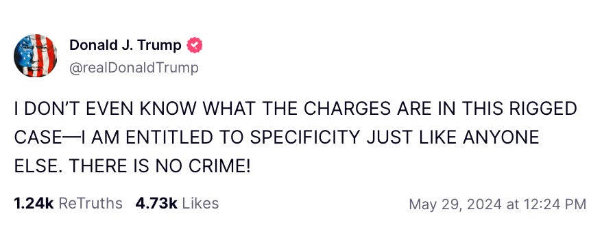 [TS] This is a ridiculous lie. They could have called whatever witness he wanted. In the above, he’s referring to Weisselberg (Trump’s former CFO, now a convicted criminal - 5 mos in jail after pleading guilty to tax fraud charges in ‘23). And, of course, he could have taken the stand himself.