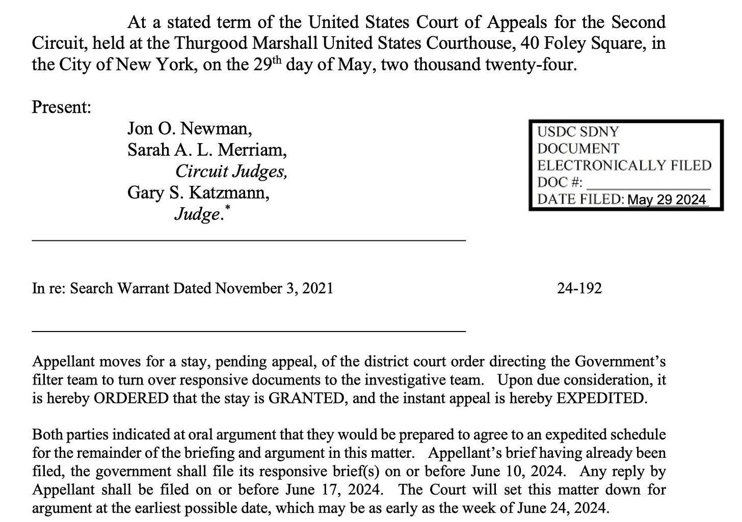 7.) Spencer Meads gets his stay pending appeal of warrant and Special Master for his phones.
