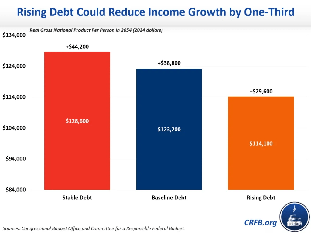 Under the CBO’s “Rising Debt” scenario, real GDP per person in 2054 would be almost $15,000 lower than the “Stable Debt” scenario, due to higher debt levels crowding out private investment and slowing growth