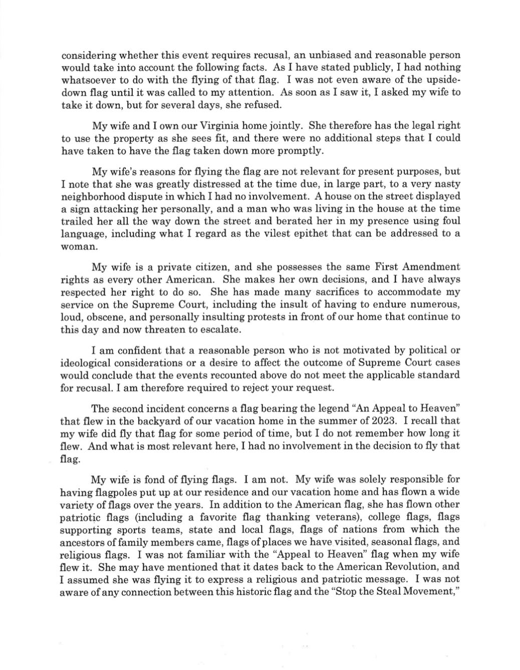 [TS] He says “I am confident that a reasonable person who is not motivated by political or idealogical considerations or a desire to affect the outcome of Supreme Court cases would conclude that the events recounted above do not meet the applicable standard for recusal.” Essentially saying that he’s above criticism.