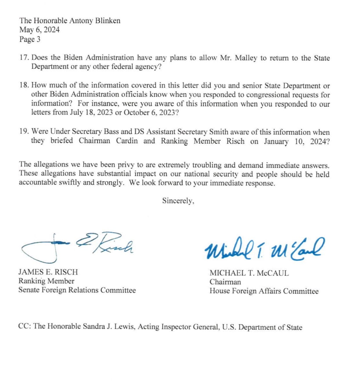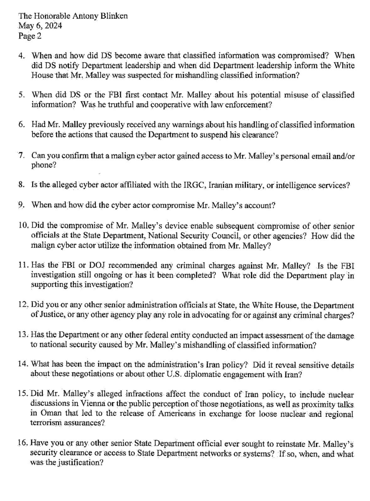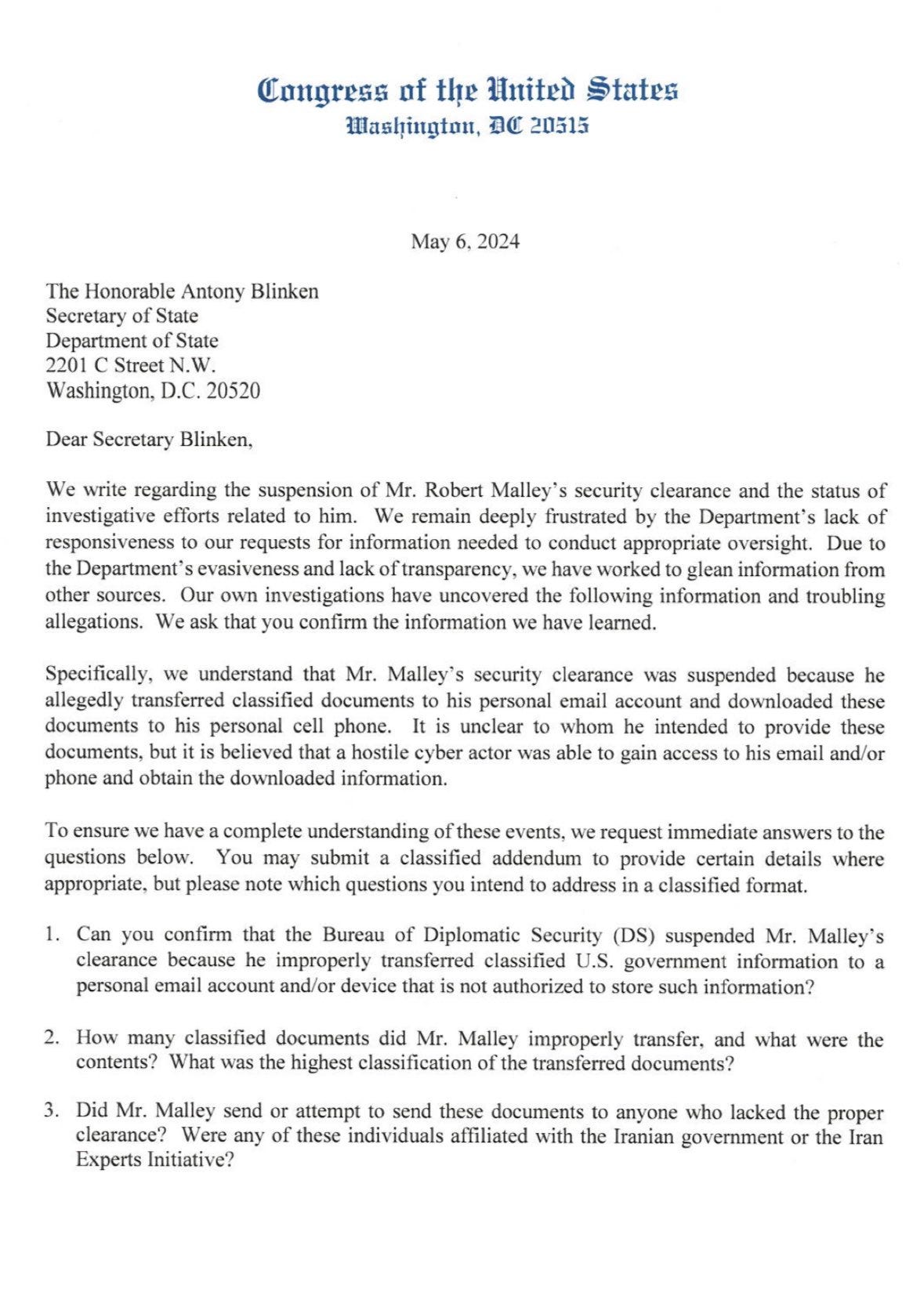 Top Republicans have written to Secretary of State Antony Blinken about the suspension of Iran Envoy Rob Malley's security clearance. The letter alleges that Malley transferred classified documents to his personal email and cell phone, which were subsequently stolen by a hostile cyber actor. Congress has had to resort to backchannels to learn about this breach, while the Iranian regime has consistently known more about Malley's suspension than Congress. The State Department initially told senior congressional staff that Malley was on extended "family leave" rather than admitting his clearance had been suspended.