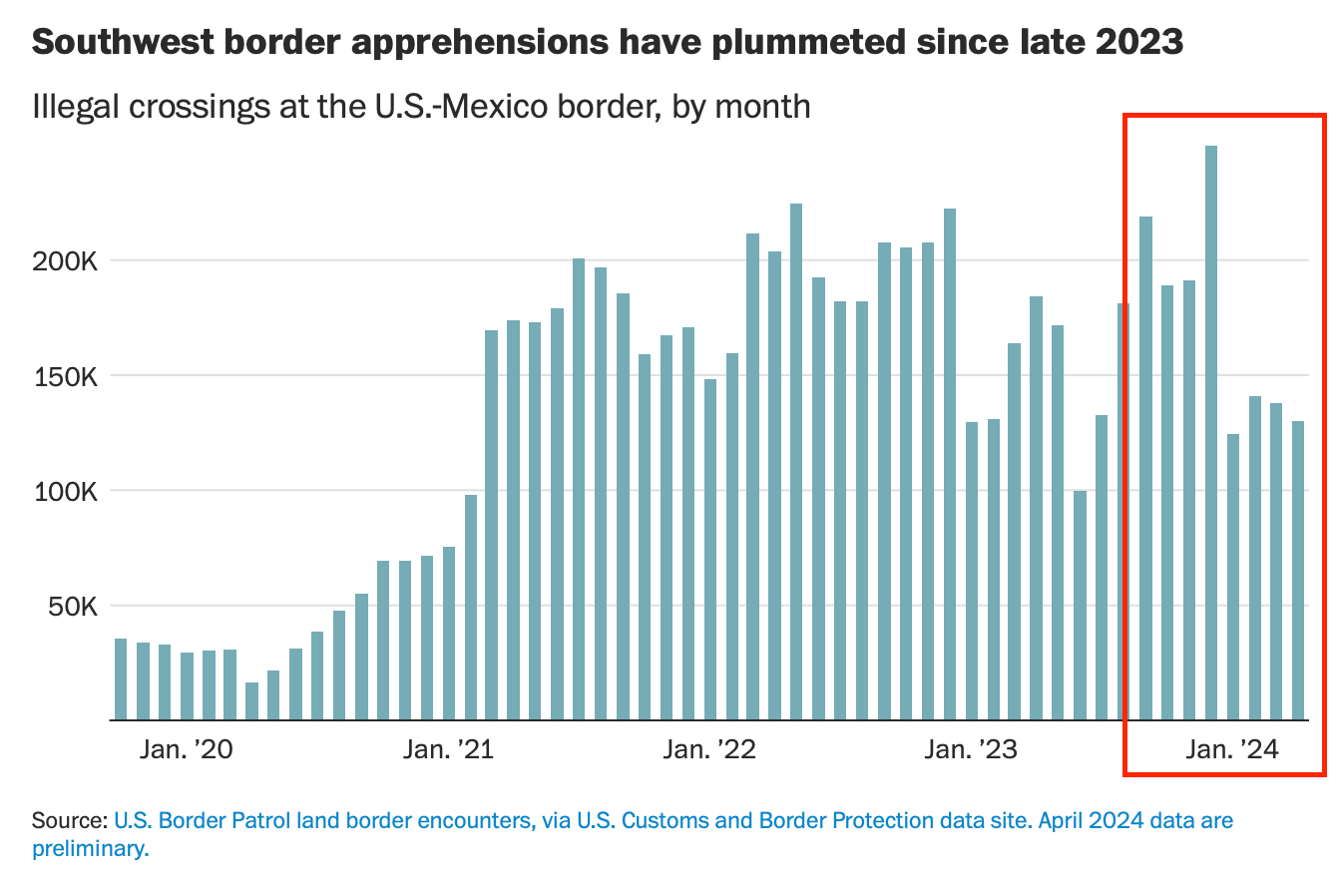 Border Crossings: According to U.S. Customs and Border Protection, illegal border crossings fell 40% from the end of 2023 to the start of 2024.