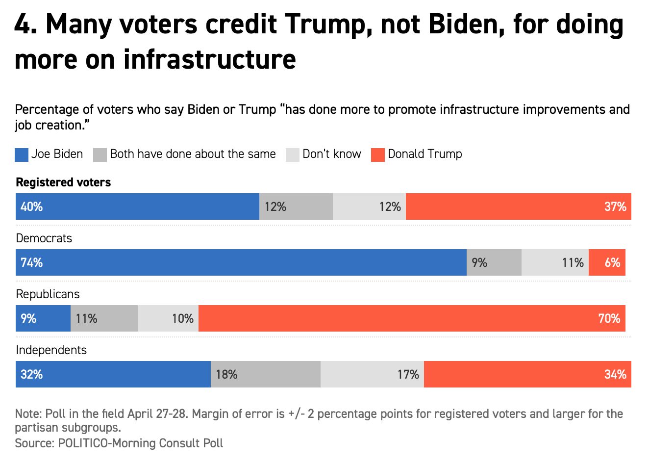 Although Biden talks quite a bit about infrastructure, I imagine people not close to the issue attribute it to Trump because he was first.