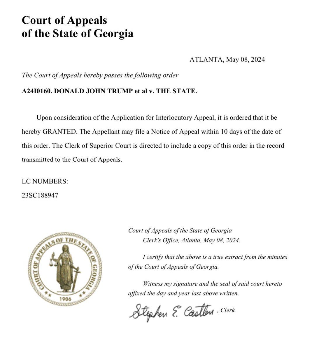 5.) [UPDATE] Trump’s GA election case: Court of Appeals agrees to hear appeal = case is likely pushed beyond election.