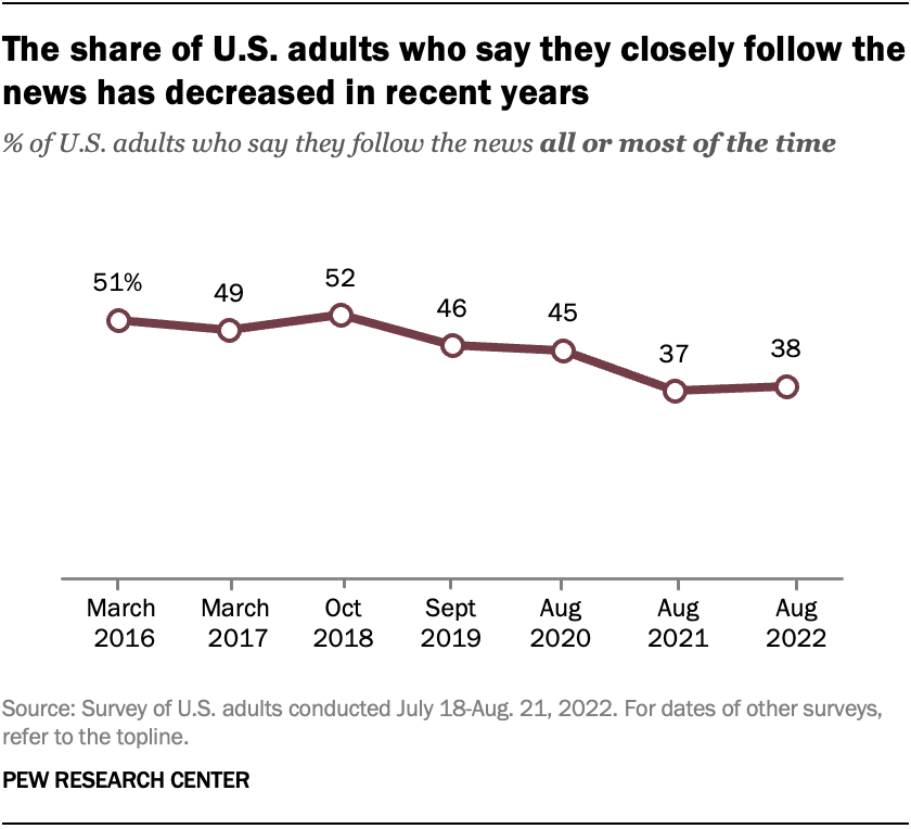 For context: Only 38% of Americans said they closely followed the news in 2022. If you're wondering why the media has failed to inform voters on some crucial issue, often the answer is that it's just losing the fight for attention to YouTube, TikTok, and Netflix.