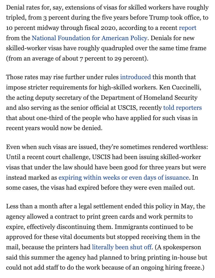 There's been credulous media coverage of Trump's "proposal" to give green cards to immigrant US college grads. It's odds with everything Trump actually did as president, to reduce *legal, skilled* immigration. Examples of actual policies he put in place, curbing visas, work permits, or green cards for skilled immigrants