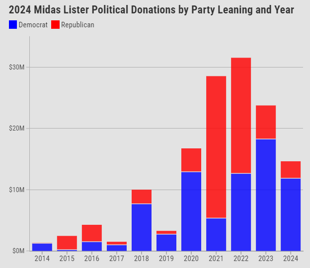 In 2024, top VCs still lean left. Midas Listers gave $11.9m to democrats vs just $2.8m to republicans.