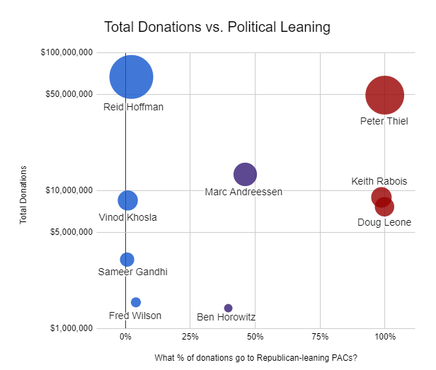 The vast majority of political donations (in terms of dollars) comes from a few huge donors. Reid Hoffman has given over $66m and Peter Thiel has given over $49m (all time).