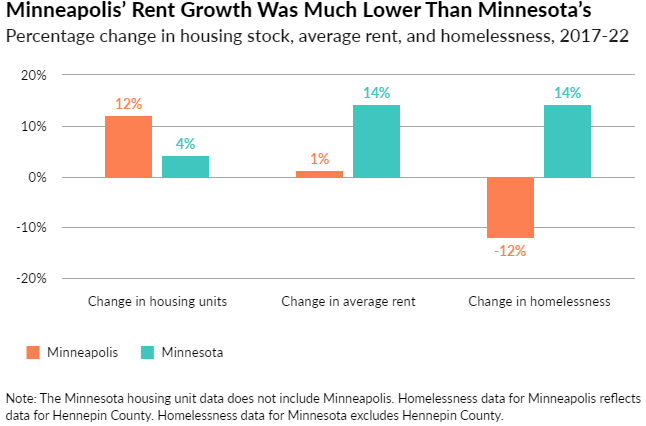 Housing Crisis: Communities with strict zoning laws face higher housing costs, rent growth, and homelessness rates. Minneapolis vs. Minnesota comparison illustrates the impact.