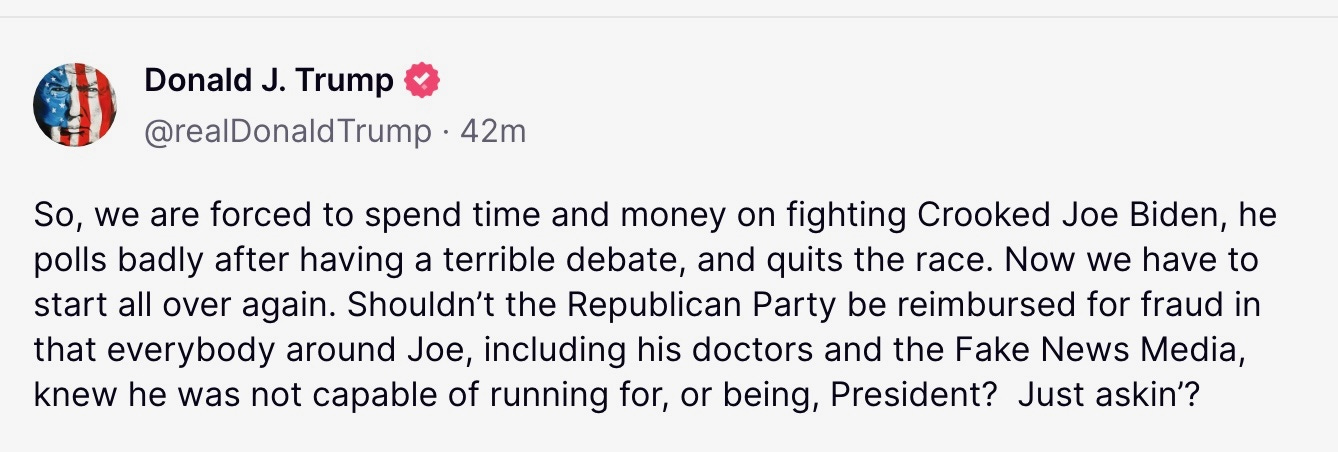 [TS] What else is there to say? First, let me acknowledge that my prediction was wrong. After the first week-ish after the debate I did not suspect Biden would drop out.