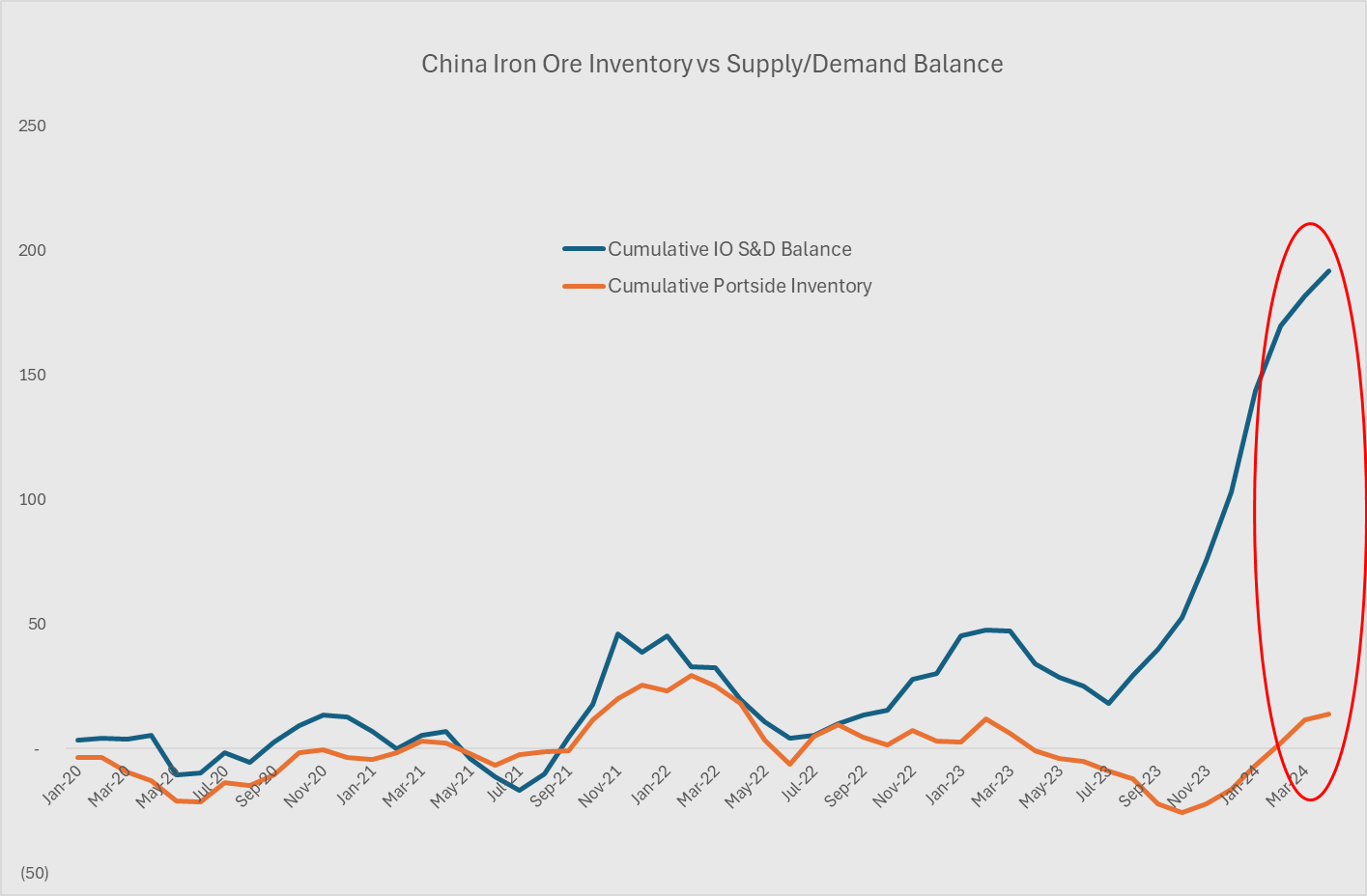 Something odd is happening in China's iron ore market: In the last 12 months, inventory levels are up marginally (~15mt), yet the difference between iron ore supplied and iron ore used is up a staggering 158mt.