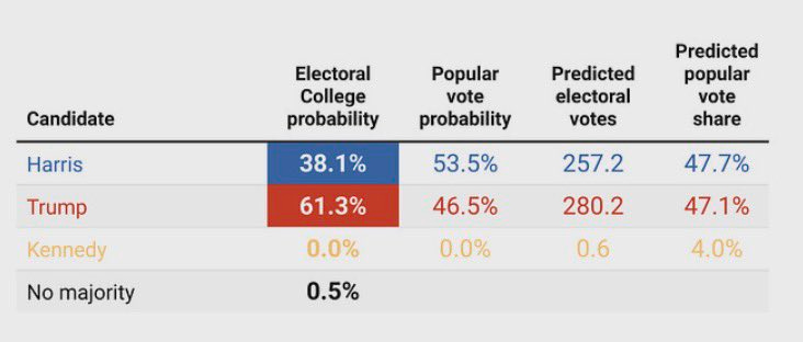 Nate Silver’s model now has Harris favored in the popular vote but still at a significant electorate college underdog: