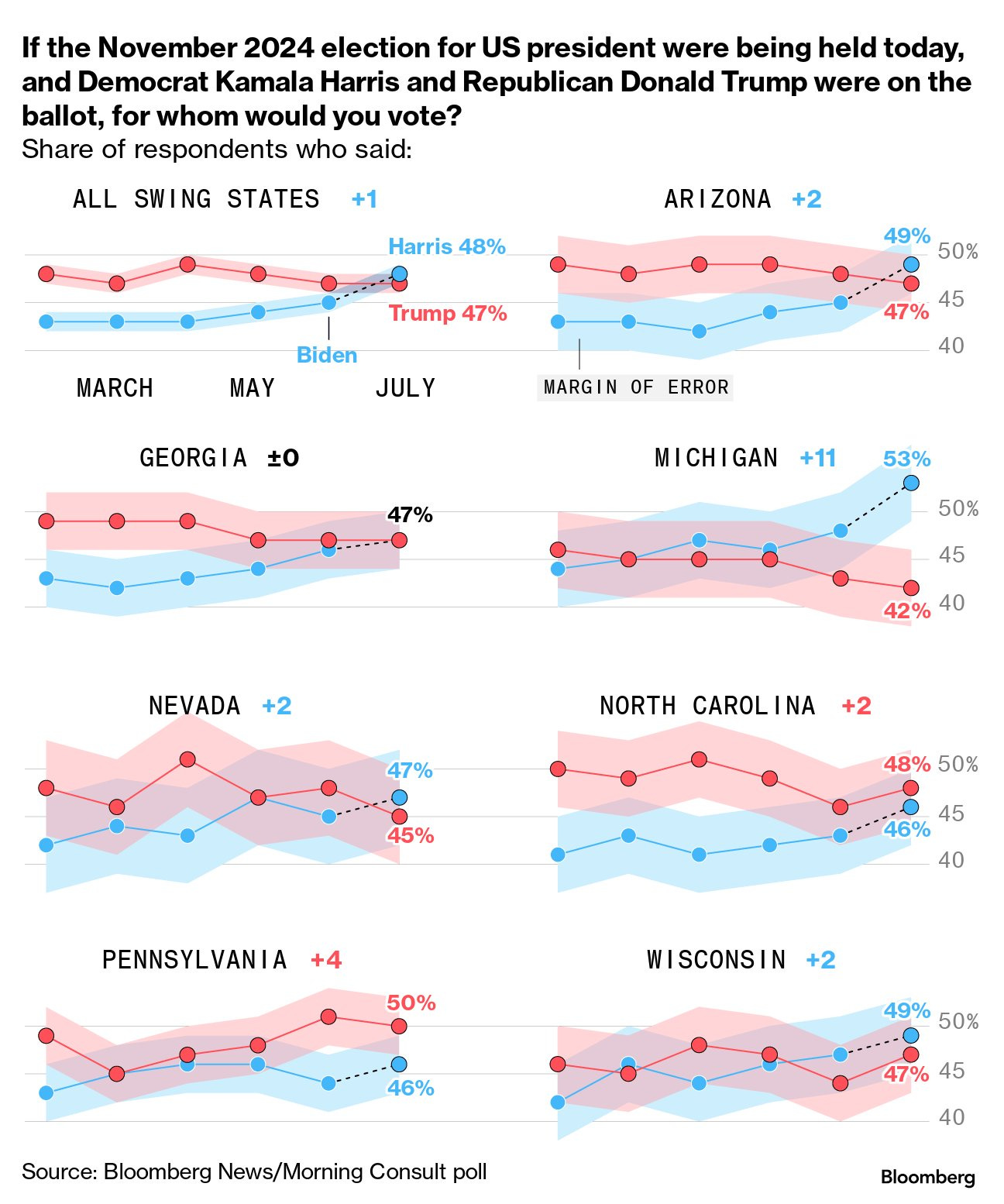 Harris Polling Update: Closing leads in swing states, but still an electoral college underdog.
